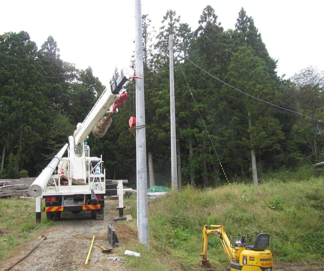 建柱車やバックホウなどによる建柱工事